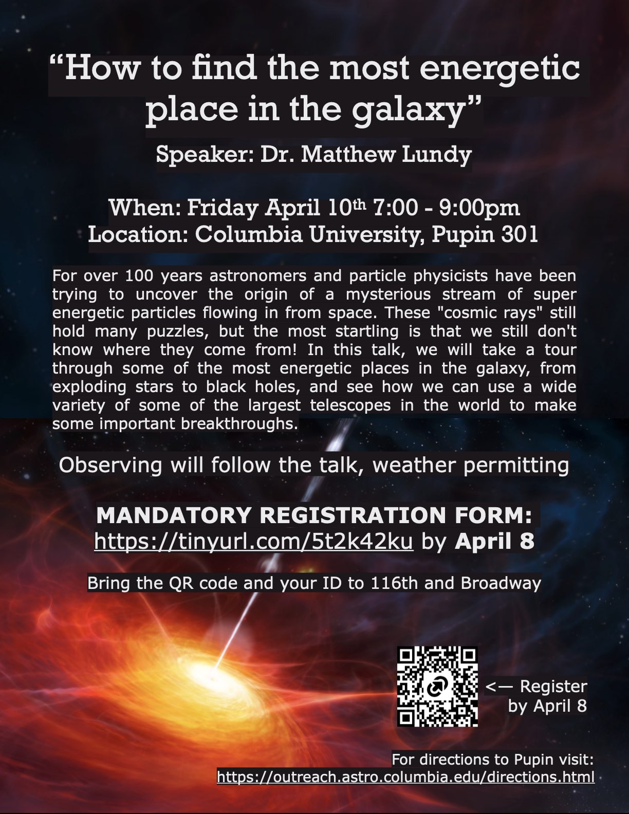 Pupin Hall 301 Friday, April 10 at 7pm -- Join us in for a Public Lecture with Dr. Matthew Lundy who will talk about cosmic rays. Click on the image to RSVP by midnight April 8!