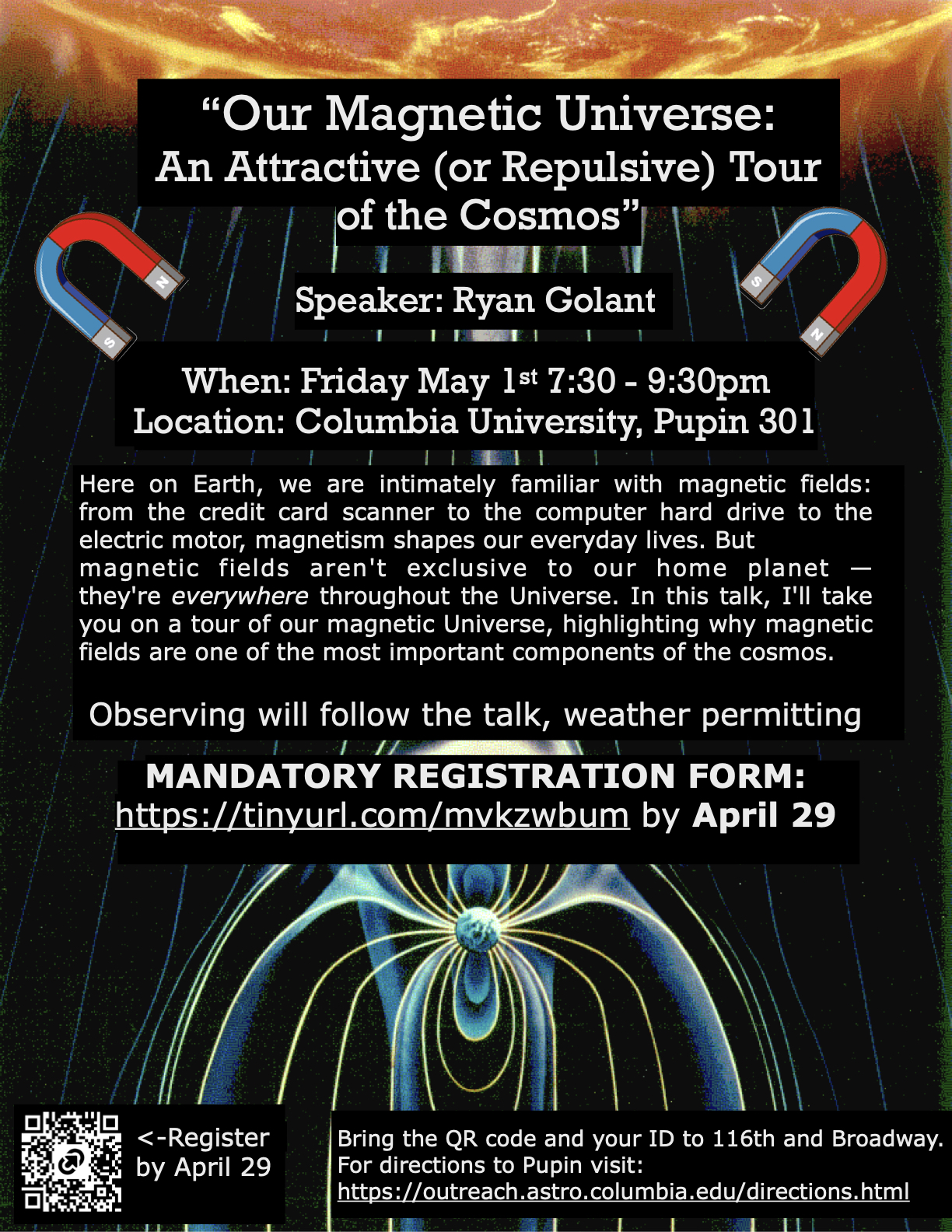 Pupin Hall 301 Friday, May 1 at 7:30pm (note the later time!) -- Join us in for a Public Lecture with Ryan Golant who will talk about magnetic fields. Click on the image to RSVP by midnight April 29! If you can't join us in person, we also broadcast live on Youtube.
